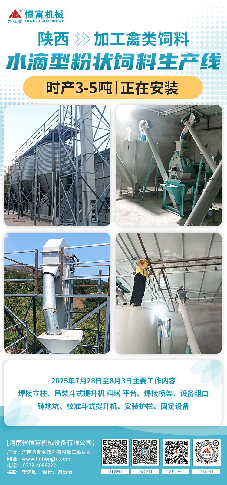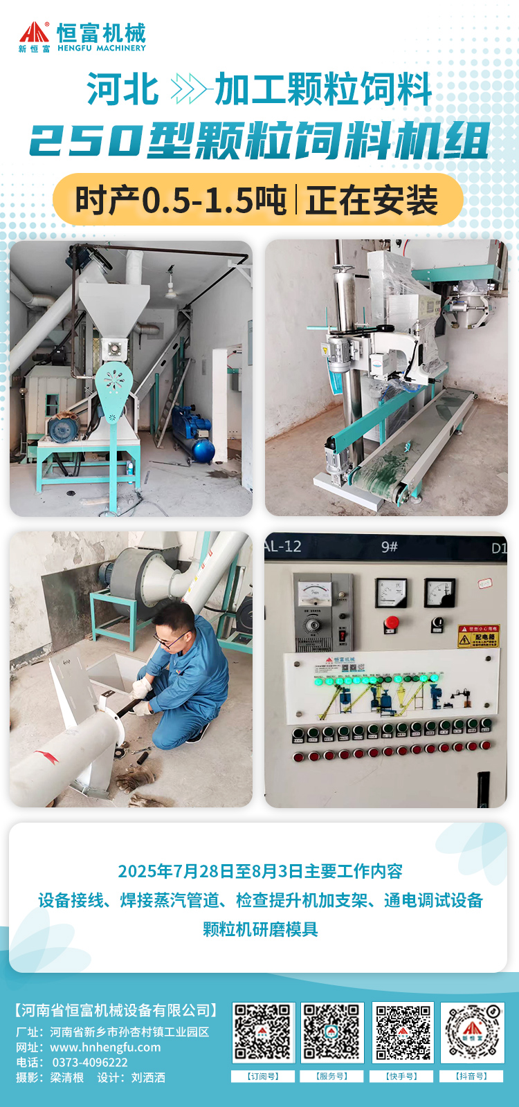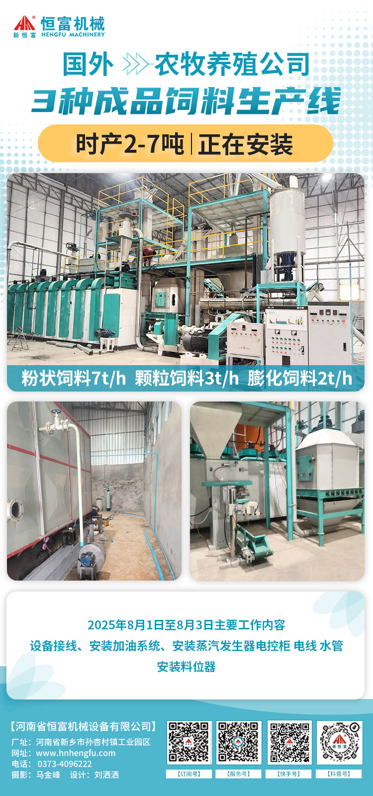 陕西 500 型平模颗粒饲料机组,用于加工牛羊草粉颗粒饲料部分自用、部分外销已安装完成。 主要设备包括多功能饲料粉碎机、锤片粉碎机、单轴双螺带饲料混合机、500 型平模颗粒机、逆流式冷却器、提升输送设备及电控设备等。 多功能粉碎机进料口加宽易投料;混合机混合快速均匀;平模颗粒机结构简单经济,四辊压轴出料效率加倍;冷却器冷却后颗粒温差≤3-5℃。 2025年7月25日-29日安装师傅5天顺利完工! 现场图片: 国外 | 3种成品饲料生产线 机组简介: 国外农牧养殖公司的 3 种成品饲料生产线正在安装。 前端共用一套配料、粉碎、混合、气动四通系统。粉状饲料直接进入饲料包装机;颗粒线中间配环模饲料颗粒机、逆流式饲料冷却器、饲料破碎机,振动筛和包装机;膨化线中间配饲料膨化机、烘干机,后端设喷涂机、冷却器和包装机。 2025年7月28日至8月5日安装师傅工作内容:走信号线,电柜串线,装加油系统;接线,安装锅炉电柜,接水管,加装料位器,电柜加装开关等。 工艺流程: 陕西 | 时产3-5粉状饲料机组 机组简介: 陕西养鸡场老板订购的时产3-5吨粉状饲料机组正在安装。 主要设备有:3个15吨料塔、玉米除杂机、2 立方饲料配料秤、水滴式饲料粉碎机、2立方饲料混合仓、1吨卧式单轴双螺带饲料混合机、2立方饲料成品仓、提升输送设备及电控设备。 流程为先配料后粉碎:原料经提升机送入料塔,再输送至除杂机除杂后进入配料秤完成配料;粉碎后的物料与预混料、添加剂等混合,最终送入成品仓。 2025年7月28日至8月5日主要工作内容: 焊接立柱,装斗提带,清理地坑水,吊装斗提,料塔平台,焊接桥架,铺地坑,组口。 工艺流程: 河北 | 250型颗粒饲料机组 机组简介: 河北石家庄时产500公斤-1吨做小白鼠颗粒饲料的机组正在安装。 结合场地条件,技术人员策划了精料颗粒机组,设备含饲料粉碎机、卧式单轴双螺带饲料混合机、250 型环模饲料颗粒机、逆流式冷却器及打包机等。方案结构紧凑,覆盖全生产流程,适配中小型养殖场及饲料厂需求。 2025年7月28日至8月5日主要工作内容:接线,焊蒸汽管道,蒸汽试压,输送机减速机换角度,摆放真空机,与客户沟通接线。 工艺流程: 国外 | 320型颗粒饲料机组 机组简介: 国外时产2-3吨鸡颗粒饲料加工机组正在安装。 结合需求与场地,配置初清筛及 500 吨、50 吨钢板仓保障原料供应,配备含环模饲料颗粒机、饲料冷却器、破碎机、饲料自动打包机的自动化控制系统实现全流程自动化生产。配料粉碎混合环节含配料秤、饲料粉碎机、脉冲除尘器及饲料混合机,混合饲料部分直接包装、部分制粒。 2025 年 7 月 28 日至 8 月 5 日主要工作:清理场地、检查设备并做好准备工作,陪同采购螺丝、打包线等物料,检修并刷漆设备、接气管,完成钢板仓起吊、原料栏装载及地坑水清理等,同步向客户讲解设备原理、使用与保养知识等。 工艺流程: 新疆 | 两套时产30-40吨粉状饲料生产线 机组简介: 新疆伊尔克什坦口岸,两套时产30-40吨粉状饲料生产线正在逐步安装。 方案中包含3个200吨料塔用于物料的储存,两台66*120型水滴式饲料粉碎机来提高粉碎效率并确保原料的精细加工,以及一台五吨卧式单轴双螺带饲料混合机,它能实现高效均匀的混合,并可连接液体添加系统。 2025年7月28日至8月5日主要工作内容: 第一套:装料塔,装斗提,焊井字架; 第二套:对仓、焊仓、焊料仓接立柱,吊装料锥并焊接,装斗提带; 共同作业:焊三层横梁,喷四层材料,焊接后涂防锈漆。 工艺流程: 相关新闻 | HENGFUJIXIE 安装新闻 . Installation News 河南恒富机械-成套饲料加工设备安装进度【2025-7-29】 河南恒富机械-成套饲料加工设备安装进度【2025-7-22】 河南恒富机械-成套饲料加工设备安装进度【2025-7-15】 河南恒富机械-成套饲料加工设备安装进度【2025-6-24】 发货新闻 . Delivery News 国外--时产3-5吨粉料生产线+时产1吨颗粒料生产线,装车完成,已发走! 公司要闻 . Company News 恒富机械一家集生产、科研、销售、安装、售后于一体的实体企业。 如果您有饲料加工方面的需求,点击下方立即咨询~