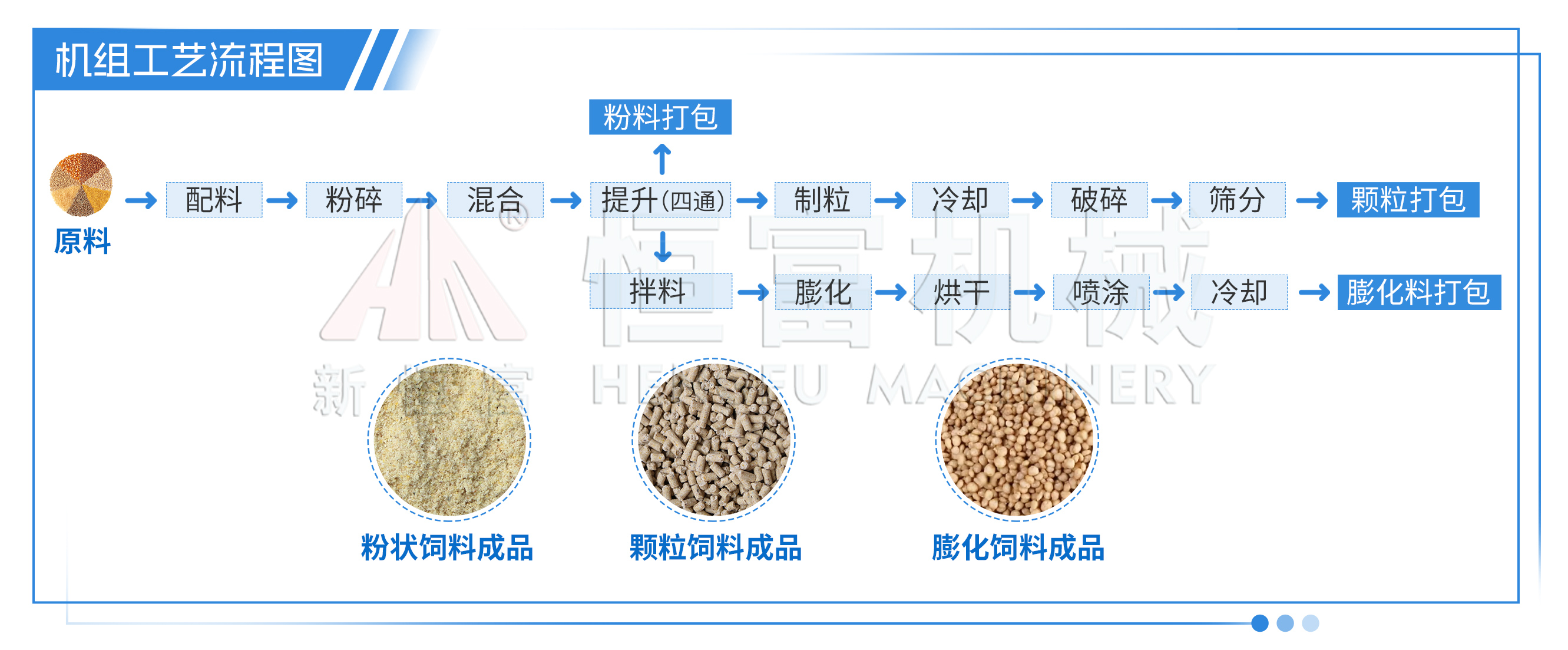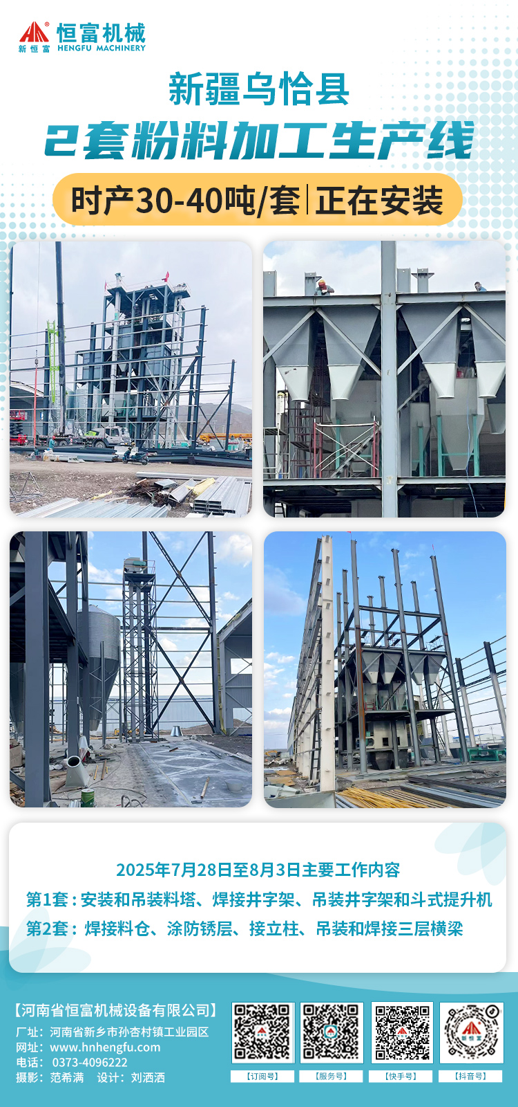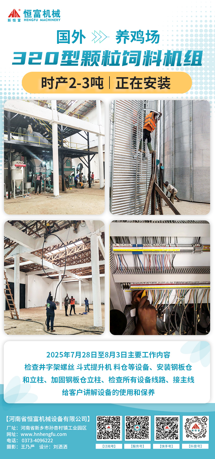 陕西 500 型平模颗粒饲料机组,用于加工牛羊草粉颗粒饲料部分自用、部分外销已安装完成。 主要设备包括多功能饲料粉碎机、锤片粉碎机、单轴双螺带饲料混合机、500 型平模颗粒机、逆流式冷却器、提升输送设备及电控设备等。 多功能粉碎机进料口加宽易投料;混合机混合快速均匀;平模颗粒机结构简单经济,四辊压轴出料效率加倍;冷却器冷却后颗粒温差≤3-5℃。 2025年7月25日-29日安装师傅5天顺利完工! 现场图片: 国外 | 3种成品饲料生产线 机组简介: 国外农牧养殖公司的 3 种成品饲料生产线正在安装。 前端共用一套配料、粉碎、混合、气动四通系统。粉状饲料直接进入饲料包装机;颗粒线中间配环模饲料颗粒机、逆流式饲料冷却器、饲料破碎机,振动筛和包装机;膨化线中间配饲料膨化机、烘干机,后端设喷涂机、冷却器和包装机。 2025年7月28日至8月5日安装师傅工作内容:走信号线,电柜串线,装加油系统;接线,安装锅炉电柜,接水管,加装料位器,电柜加装开关等。 工艺流程: 陕西 | 时产3-5粉状饲料机组 机组简介: 陕西养鸡场老板订购的时产3-5吨粉状饲料机组正在安装。 主要设备有:3个15吨料塔、玉米除杂机、2 立方饲料配料秤、水滴式饲料粉碎机、2立方饲料混合仓、1吨卧式单轴双螺带饲料混合机、2立方饲料成品仓、提升输送设备及电控设备。 流程为先配料后粉碎:原料经提升机送入料塔,再输送至除杂机除杂后进入配料秤完成配料;粉碎后的物料与预混料、添加剂等混合,最终送入成品仓。 2025年7月28日至8月5日主要工作内容: 焊接立柱,装斗提带,清理地坑水,吊装斗提,料塔平台,焊接桥架,铺地坑,组口。 工艺流程: 河北 | 250型颗粒饲料机组 机组简介: 河北石家庄时产500公斤-1吨做小白鼠颗粒饲料的机组正在安装。 结合场地条件,技术人员策划了精料颗粒机组,设备含饲料粉碎机、卧式单轴双螺带饲料混合机、250 型环模饲料颗粒机、逆流式冷却器及打包机等。方案结构紧凑,覆盖全生产流程,适配中小型养殖场及饲料厂需求。 2025年7月28日至8月5日主要工作内容:接线,焊蒸汽管道,蒸汽试压,输送机减速机换角度,摆放真空机,与客户沟通接线。 工艺流程: 国外 | 320型颗粒饲料机组 机组简介: 国外时产2-3吨鸡颗粒饲料加工机组正在安装。 结合需求与场地,配置初清筛及 500 吨、50 吨钢板仓保障原料供应,配备含环模饲料颗粒机、饲料冷却器、破碎机、饲料自动打包机的自动化控制系统实现全流程自动化生产。配料粉碎混合环节含配料秤、饲料粉碎机、脉冲除尘器及饲料混合机,混合饲料部分直接包装、部分制粒。 2025 年 7 月 28 日至 8 月 5 日主要工作:清理场地、检查设备并做好准备工作,陪同采购螺丝、打包线等物料,检修并刷漆设备、接气管,完成钢板仓起吊、原料栏装载及地坑水清理等,同步向客户讲解设备原理、使用与保养知识等。 工艺流程: 新疆 | 两套时产30-40吨粉状饲料生产线 机组简介: 新疆伊尔克什坦口岸,两套时产30-40吨粉状饲料生产线正在逐步安装。 方案中包含3个200吨料塔用于物料的储存,两台66*120型水滴式饲料粉碎机来提高粉碎效率并确保原料的精细加工,以及一台五吨卧式单轴双螺带饲料混合机,它能实现高效均匀的混合,并可连接液体添加系统。 2025年7月28日至8月5日主要工作内容: 第一套:装料塔,装斗提,焊井字架; 第二套:对仓、焊仓、焊料仓接立柱,吊装料锥并焊接,装斗提带; 共同作业:焊三层横梁,喷四层材料,焊接后涂防锈漆。 工艺流程: 相关新闻 | HENGFUJIXIE 安装新闻 . Installation News 河南恒富机械-成套饲料加工设备安装进度【2025-7-29】 河南恒富机械-成套饲料加工设备安装进度【2025-7-22】 河南恒富机械-成套饲料加工设备安装进度【2025-7-15】 河南恒富机械-成套饲料加工设备安装进度【2025-6-24】 发货新闻 . Delivery News 国外--时产3-5吨粉料生产线+时产1吨颗粒料生产线,装车完成,已发走! 公司要闻 . Company News 恒富机械一家集生产、科研、销售、安装、售后于一体的实体企业。 如果您有饲料加工方面的需求,点击下方立即咨询~
