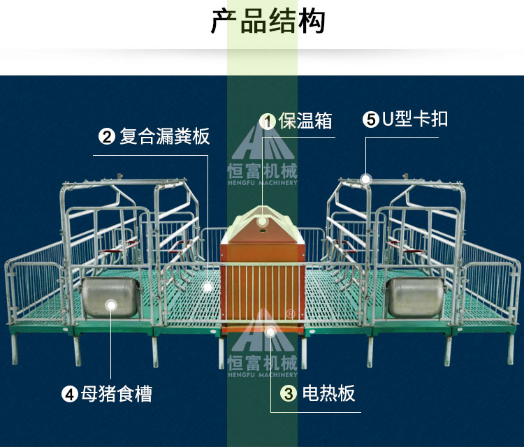 母猪产床又称高培产仔栏,主要由母猪定位架、仔猪围栏、仔猪保温箱、漏粪地板、母猪食槽和小猪补料槽等组成。