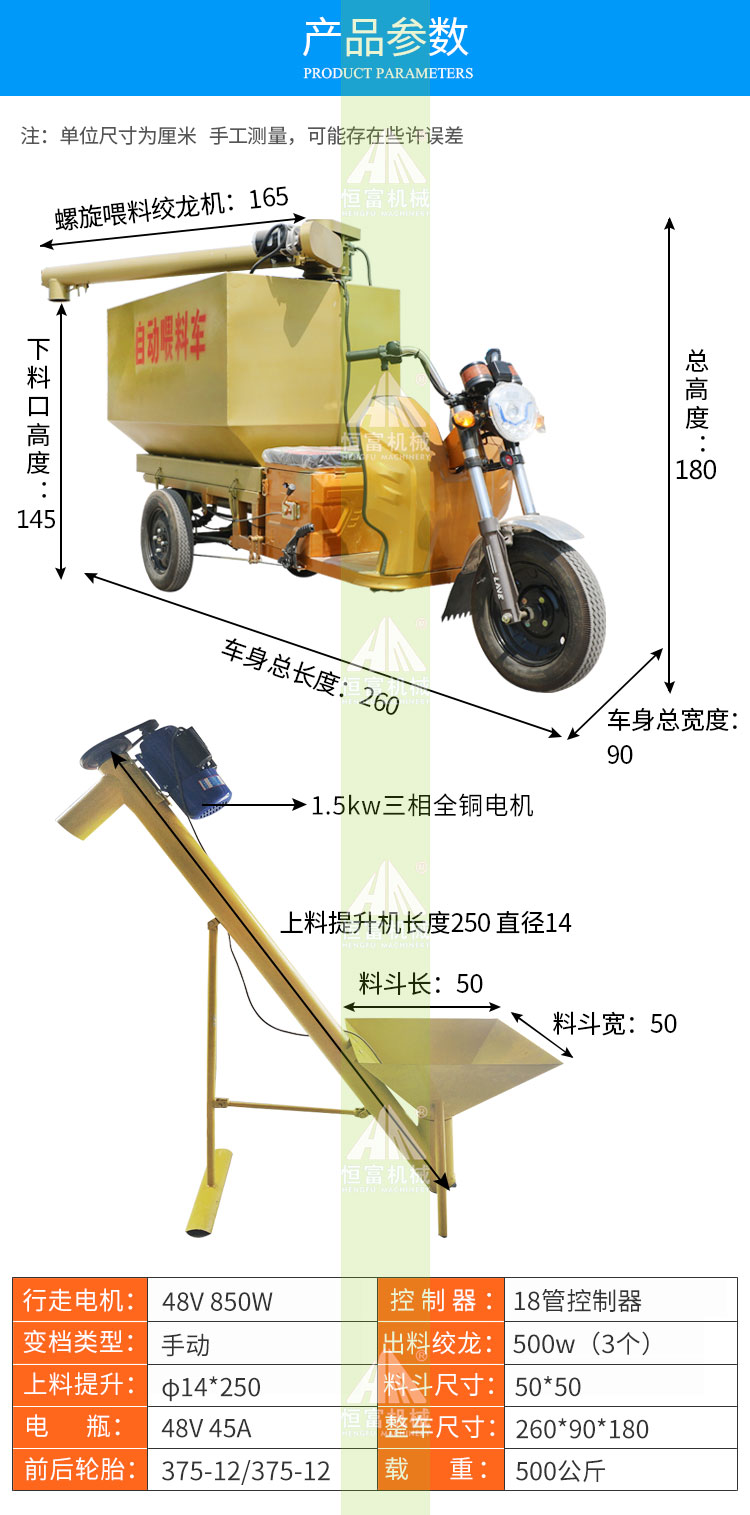自动喂料车操作流程较为简单,单人就可以完成投喂工作,是省时省力的好帮手,与TMR机配套使用,主要适用于中小型养殖场,饲料加工厂等。